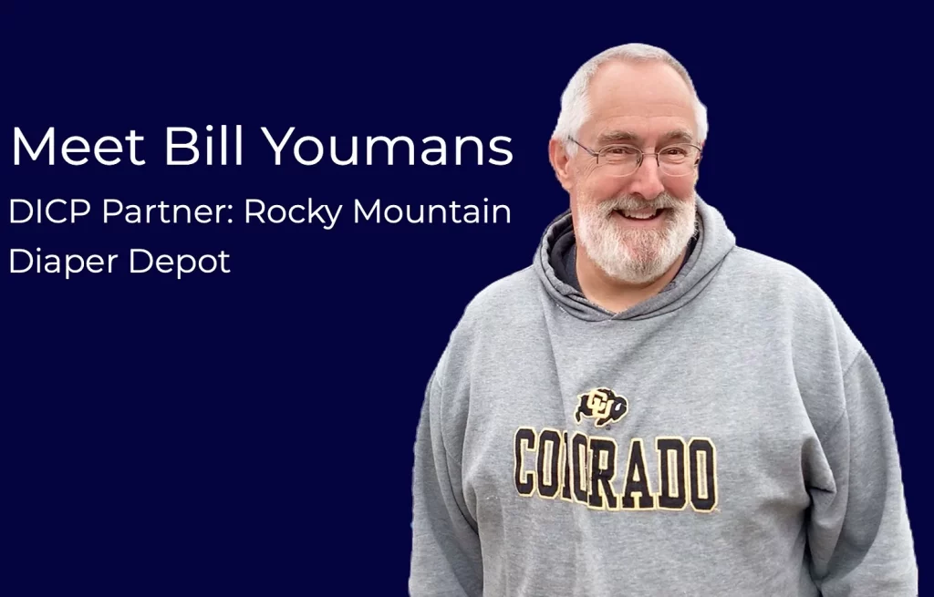 Bill Youmans of Rocky Mountain Diaper Depot is always ready with a smile and a helping hand when we arrive to pick up the diapers he and his wife Joan put together for us. They started RMDD in 2009 when they became aware of how much families were struggling with providing their babies with diapers in our community. “We hear a lot about food and socks for cold weather and hats and so forth, but we were always hearing about diapers, and it never dawned on us about how expensive these were, and what a challenge it becomes for families living in those situations to provide enough diapers to keep their kids dry and healthy and safe. So we decided to combine the idea of a food bank, but turn it into a diaper bank.” In the last five years, Rocky Mountain Diaper Depot has provided DICP with about 100,000 diapers, pull-ups, and wipes; enough entirely cover a football field. In March 2022 alone, DICP was able to help forty-two families with the diapers donated by Rocky Mountain Diaper Depot.